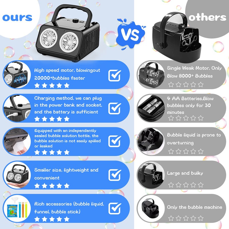 Equipped with two strong fans and a powerful motor, our electric bubble machine produces 20,000 bubbles each minute. These energetic bubbles rise swiftly, float higher, and travel further, even in calm conditions, making it the perfect bubble machine for all occasions—ideal for birthday parties, weddings, or any event in need of a bubble party machine.