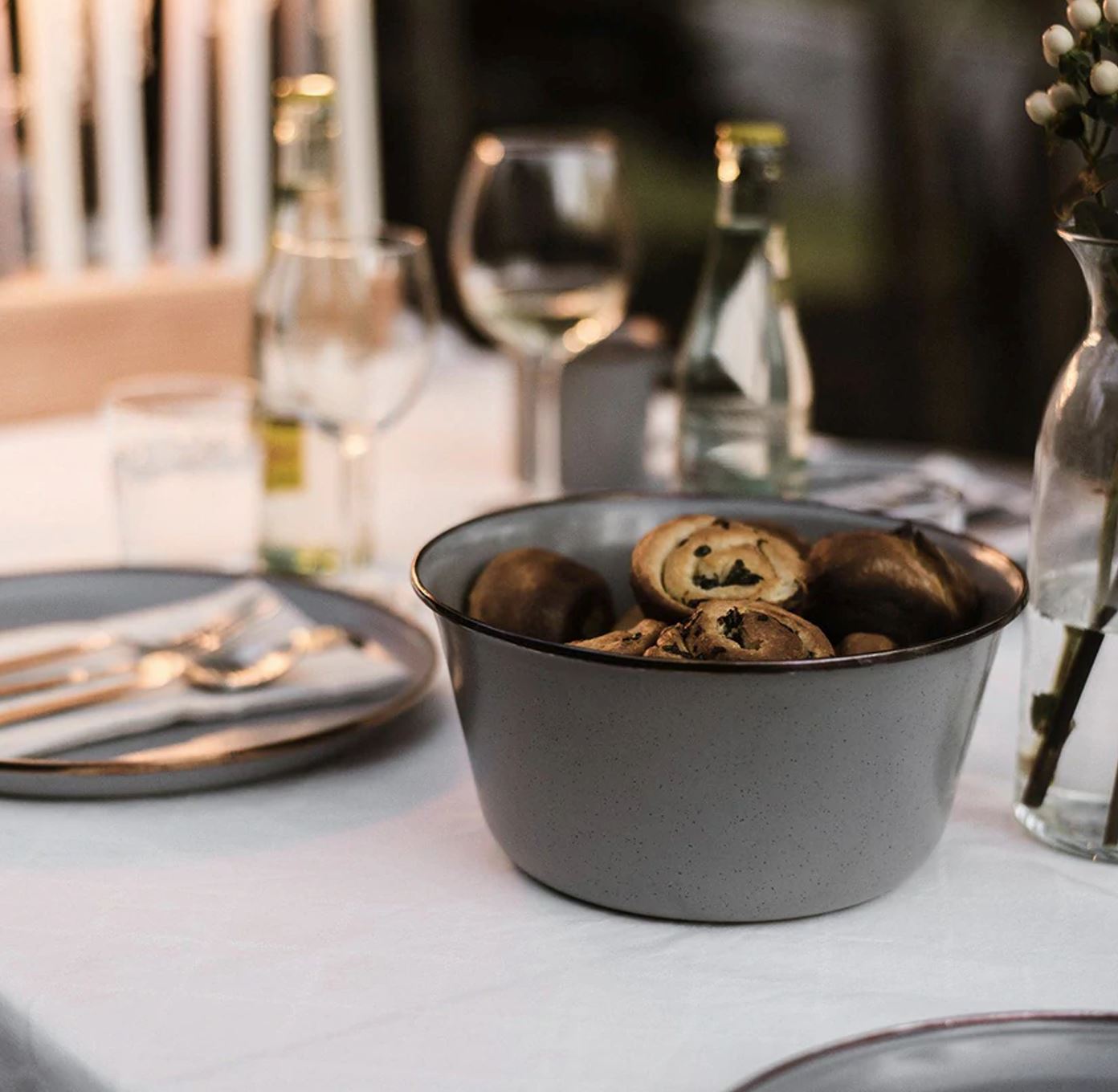 Mix both wet and dry ingredients to whip up all your beloved treats, breads, pastries, and more. Strong and elegant enough for both outdoor adventures and kitchen use, this mixing bowl set features handcrafted, burnished stainless steel accents that provide a bronze-like patina finish. Lightweight and stackable. Available in Eggshell and Slate Grey.