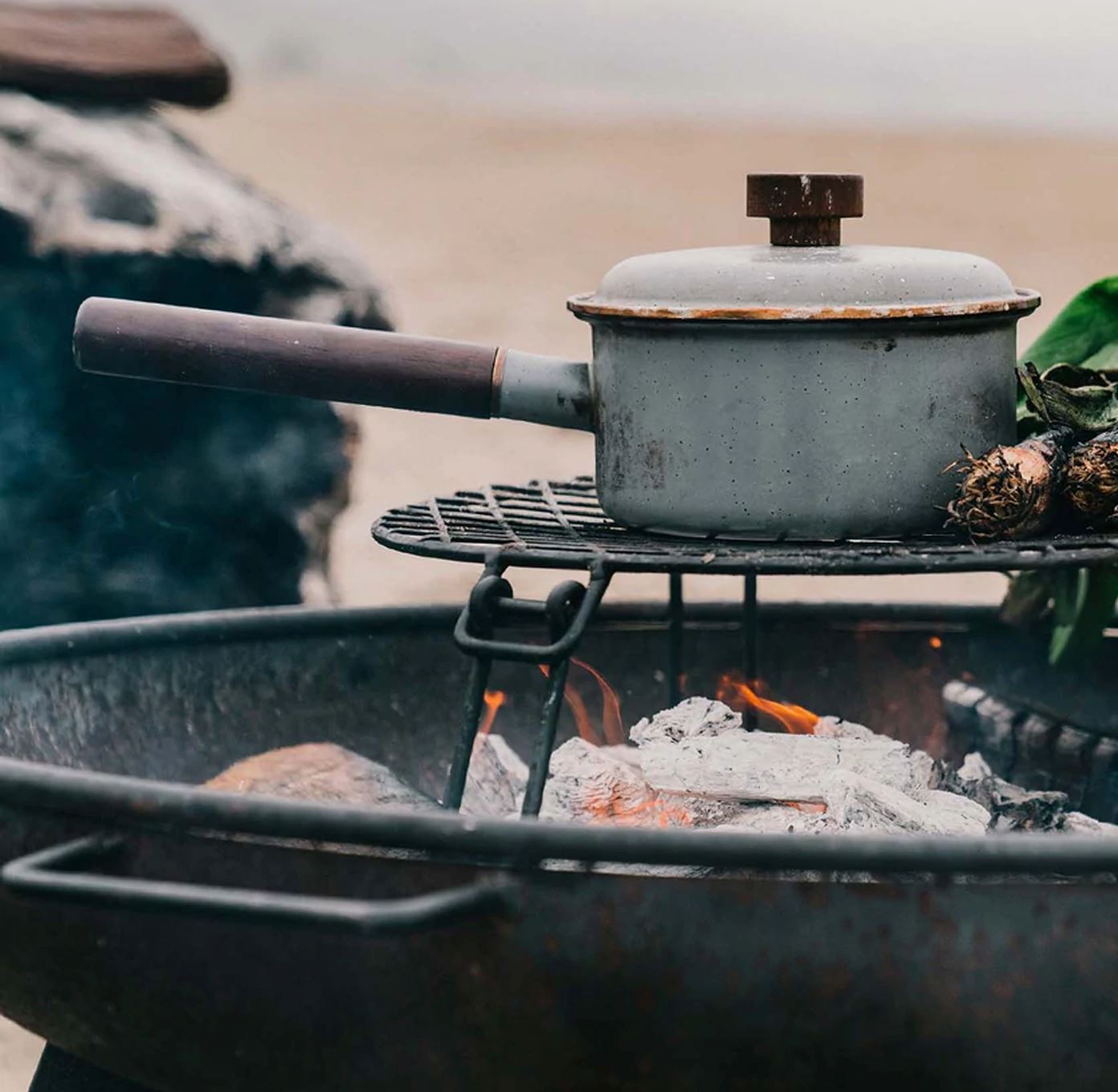 Cook and serve sauces, soups, and more effortlessly. The extended walnut handle and steep pan edges shield you from splattering liquids. Stylish enough for both camping gear and kitchen use, this sauce pan features a handmade, baked stainless steel trim that develops a patina finish reminiscent of bronze.
