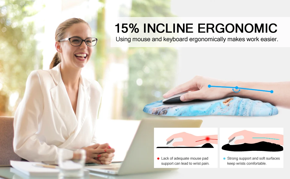 Constructed from 100% memory foam, our wrist supports aim to deliver enduring comfort and assistance that maintain their shape over time, in contrast to gel alternatives. The 15-degree incline makes a significant difference by promoting proper wrist positioning to lessen pressure and decrease the chances of developing carpal tunnel issues. Whether you're an avid gamer, a work professional, or a creative individual, our ergonomic support system is essential for anyone spending long hours at a workstation.