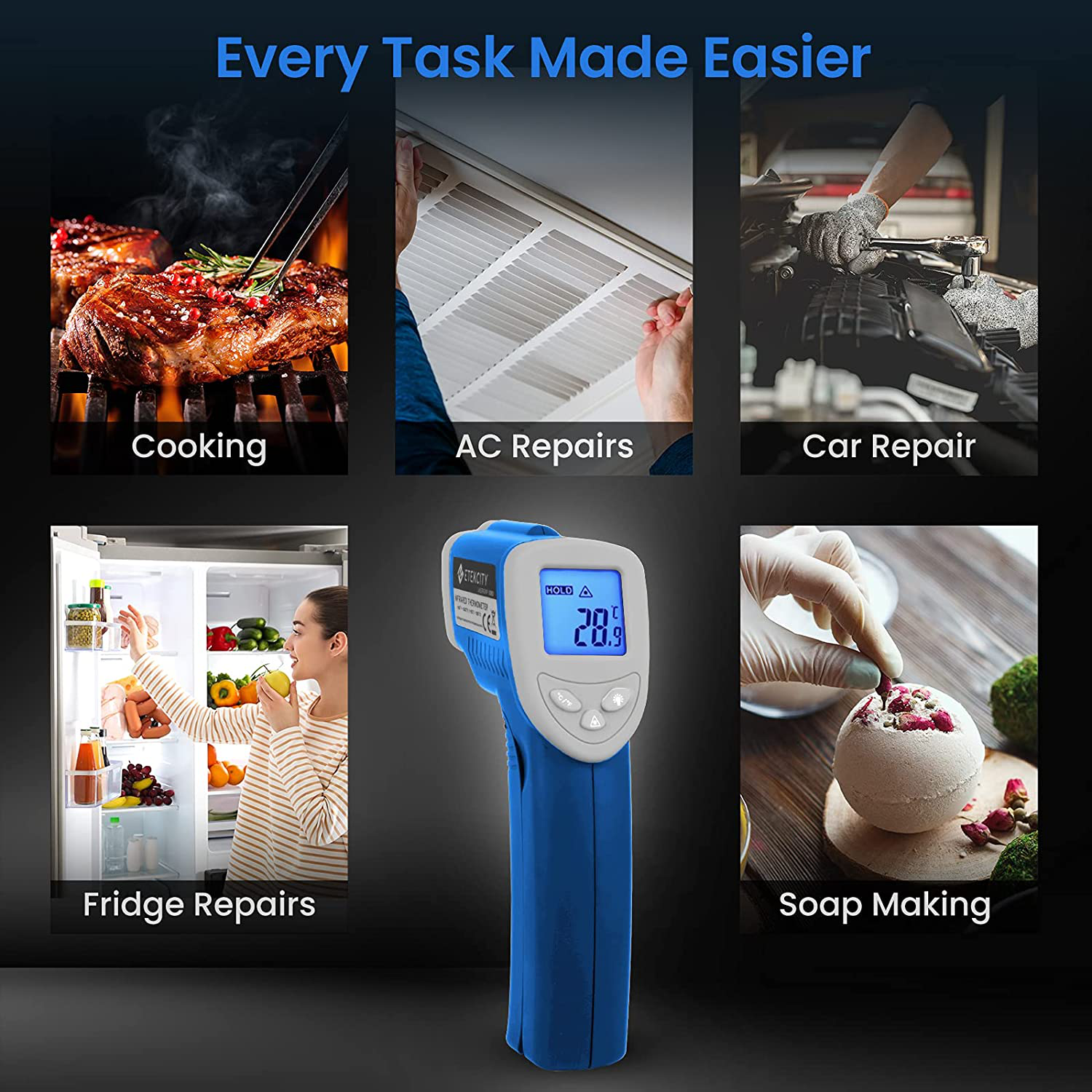 Etekcity Gun Non-Contact -58°F to 1022°F (-50°C to 550°C) with Adjustable Emissivity & Maximum Measurement for Meat Refrigerators, Swimming Pools, Ovens, in Blue