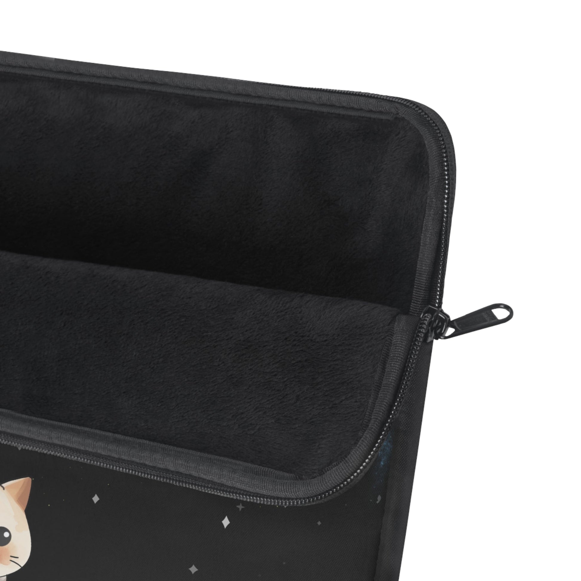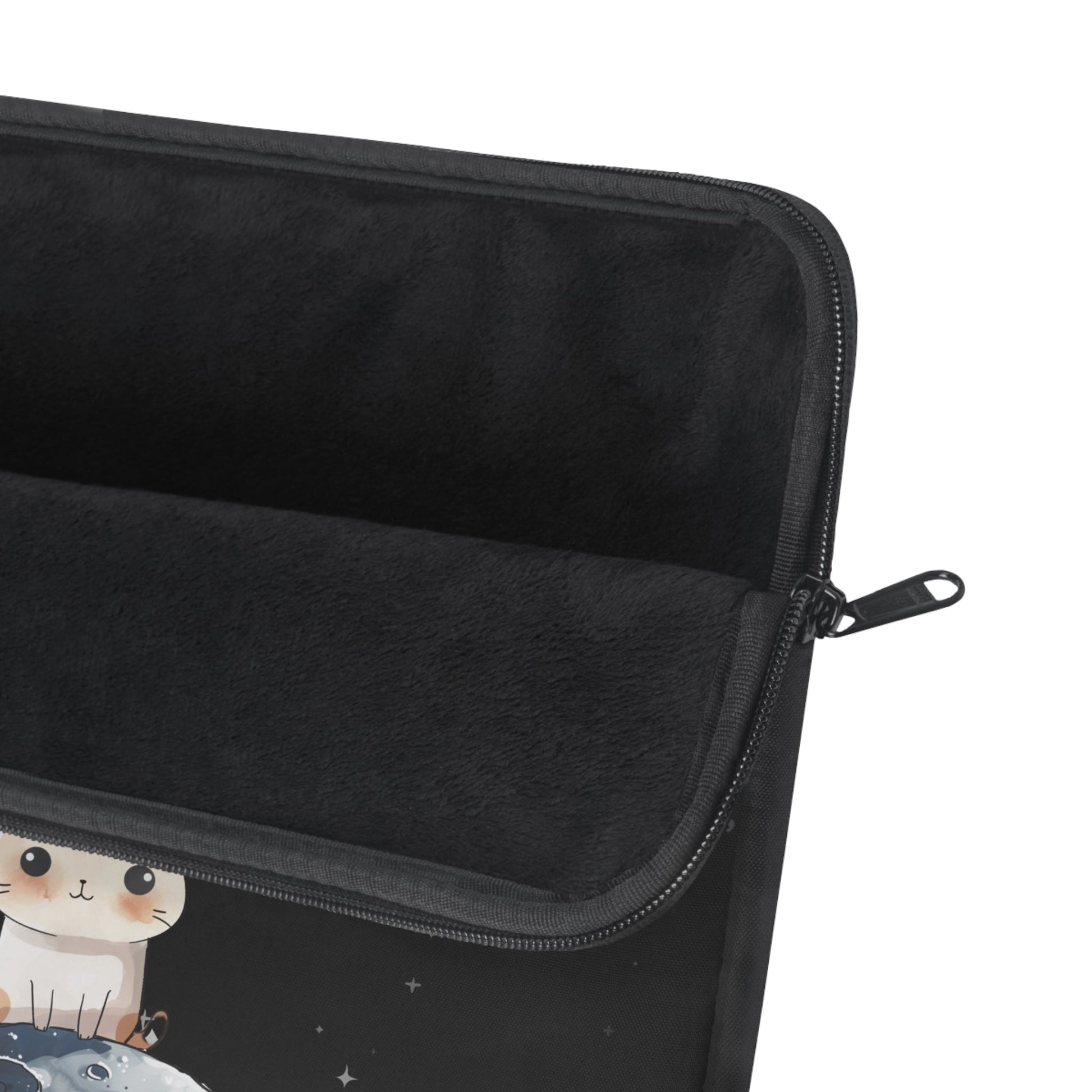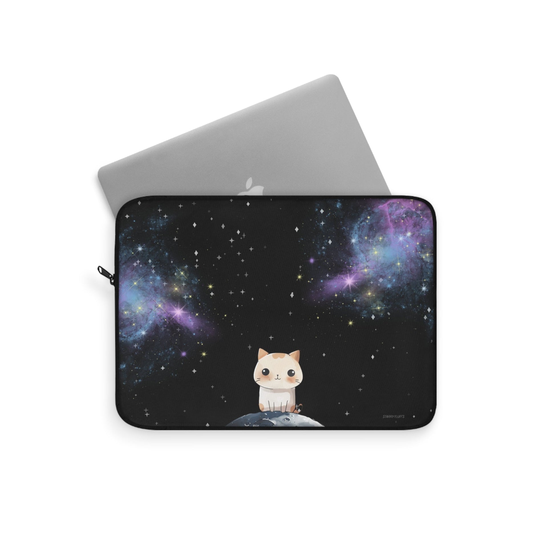 Transport your laptop in style with the Skorter Fluff's Cosmo the Cat Laptop Sleeve, available in three sizes to ensure a snug fit while safeguarding your device from scratches and minor bumps. This premium sleeve showcases a lively design of our cherished, space-themed characters on one side, paired with a sleek black reverse, trim, and zipper. It perfectly combines elegance with practicality, making it a fashionable accessory for your everyday escapades.