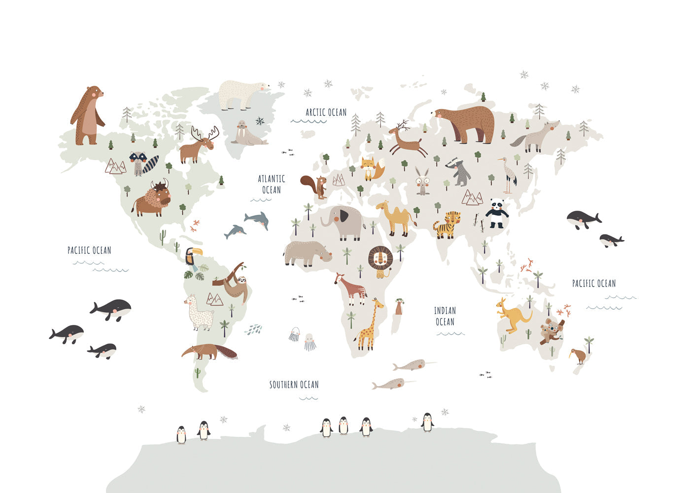 Kids' Poster Map Highlighting Animals in Soft Tones