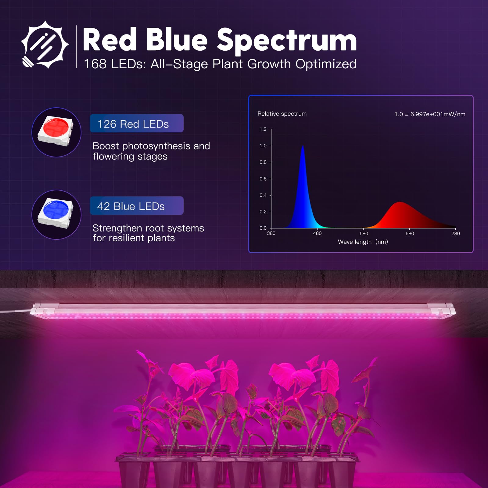 - **Red & Blue Spectrum**: Harness the power of advanced red and blue LEDs, featuring wavelengths of 640-680nm to encourage blooming and fruiting, and 440-460nm to strengthen plant structure and boost photosynthesis. This combination promotes a robust and flourishing indoor garden.