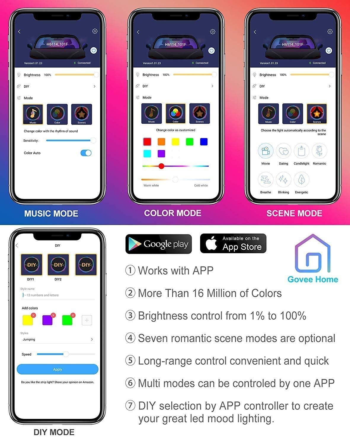 In contrast to the typical four-strip lights, Govee offers a novel setup with two lines connecting four strip lights. The intuitive design streamlines installation, utilizing inconspicuous wires for a tidy look in your vehicle.