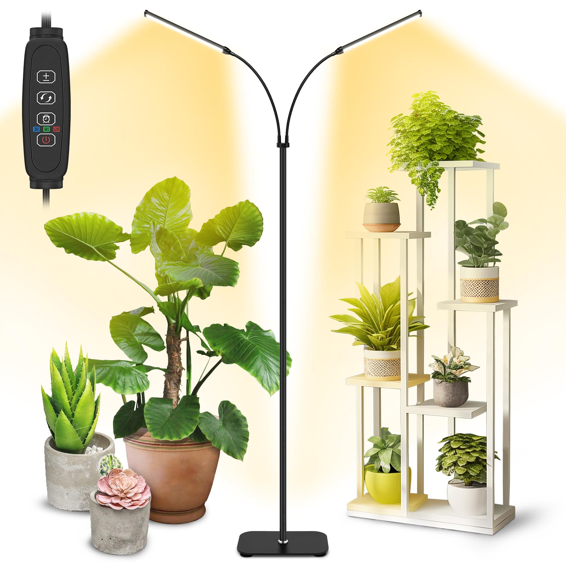 Skorter | Growth Light Dual Head Plant Light For Indoor Growth, 30W 144Leds Full Spectrum Wide Lighting Area, 5.5Ft Height Telescopic Stand, Dimmable, Automatic On/Off Timer, Floor Grow Lamp For Various Plants
