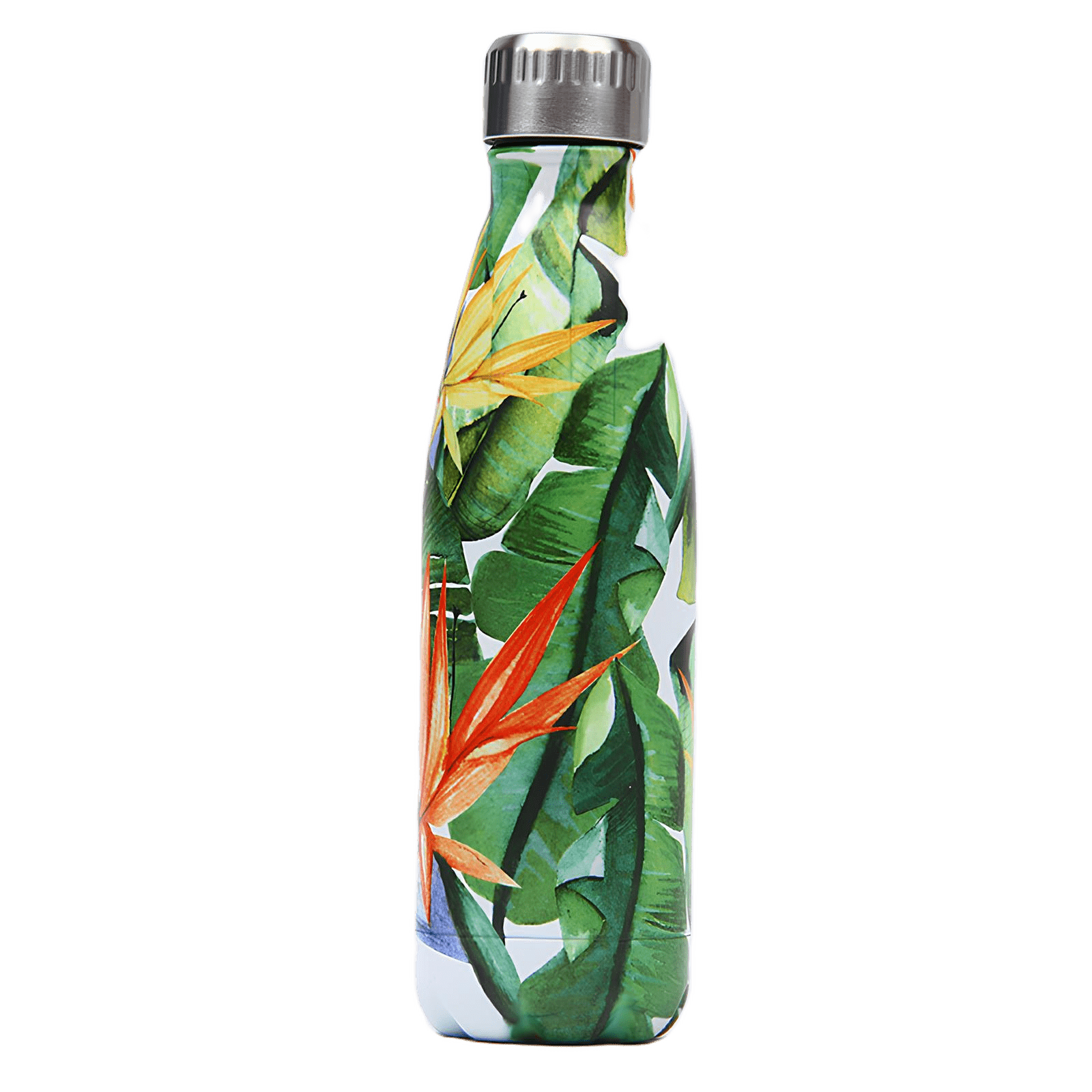 Experience the tropical blend in every sip - Our Skorter in stainless steel, adorned with a stunning tropical leaf design, serves as the perfect companion to keep your beverages cool under the blazing sun.