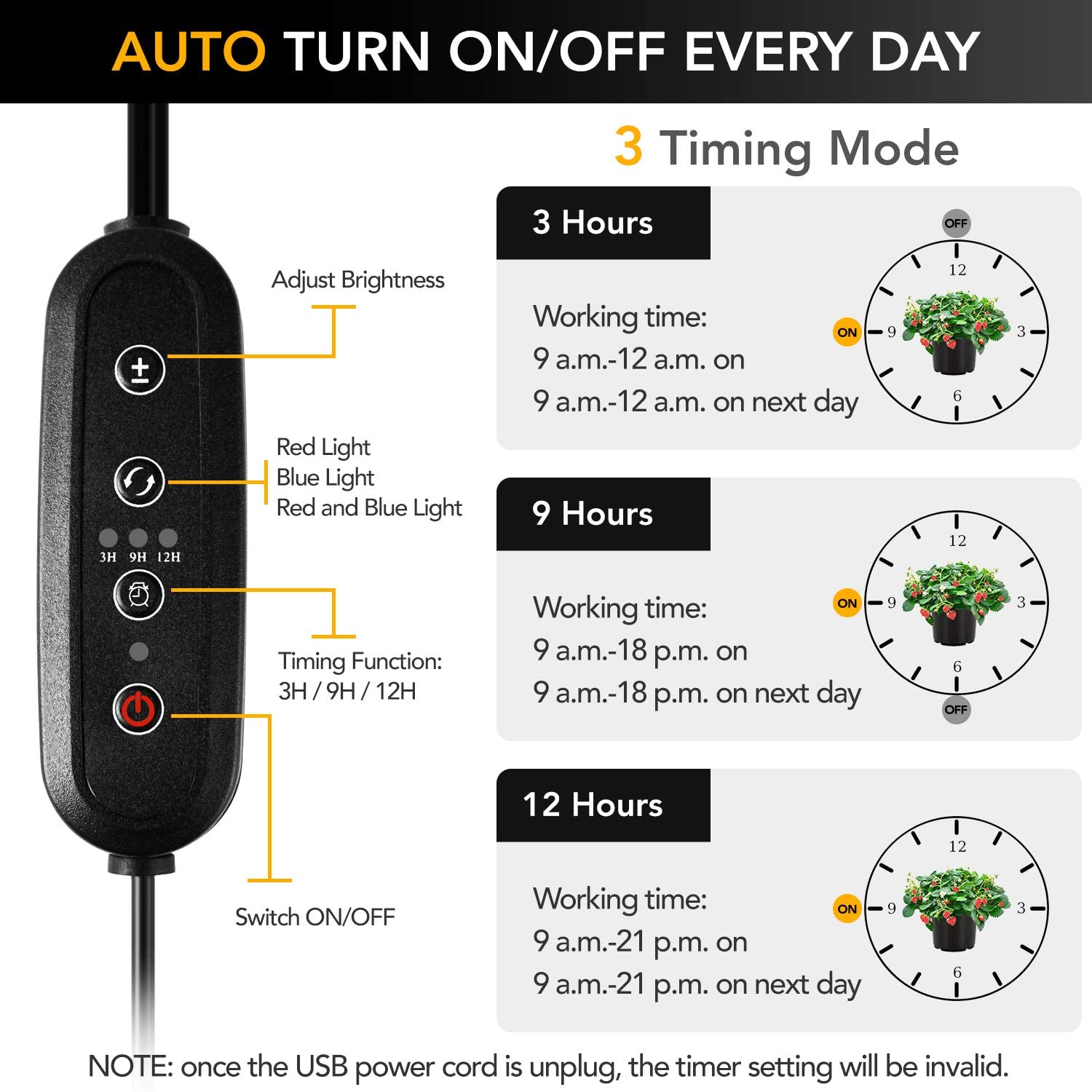 - **Automatic On/Off Timer**: The advanced auto-cycle offers 3/9/12 hour timing options, allowing the grow light to turn on and off automatically based on your preferences. This guarantees that your plants receive consistent lighting without the hassle of manual operation.