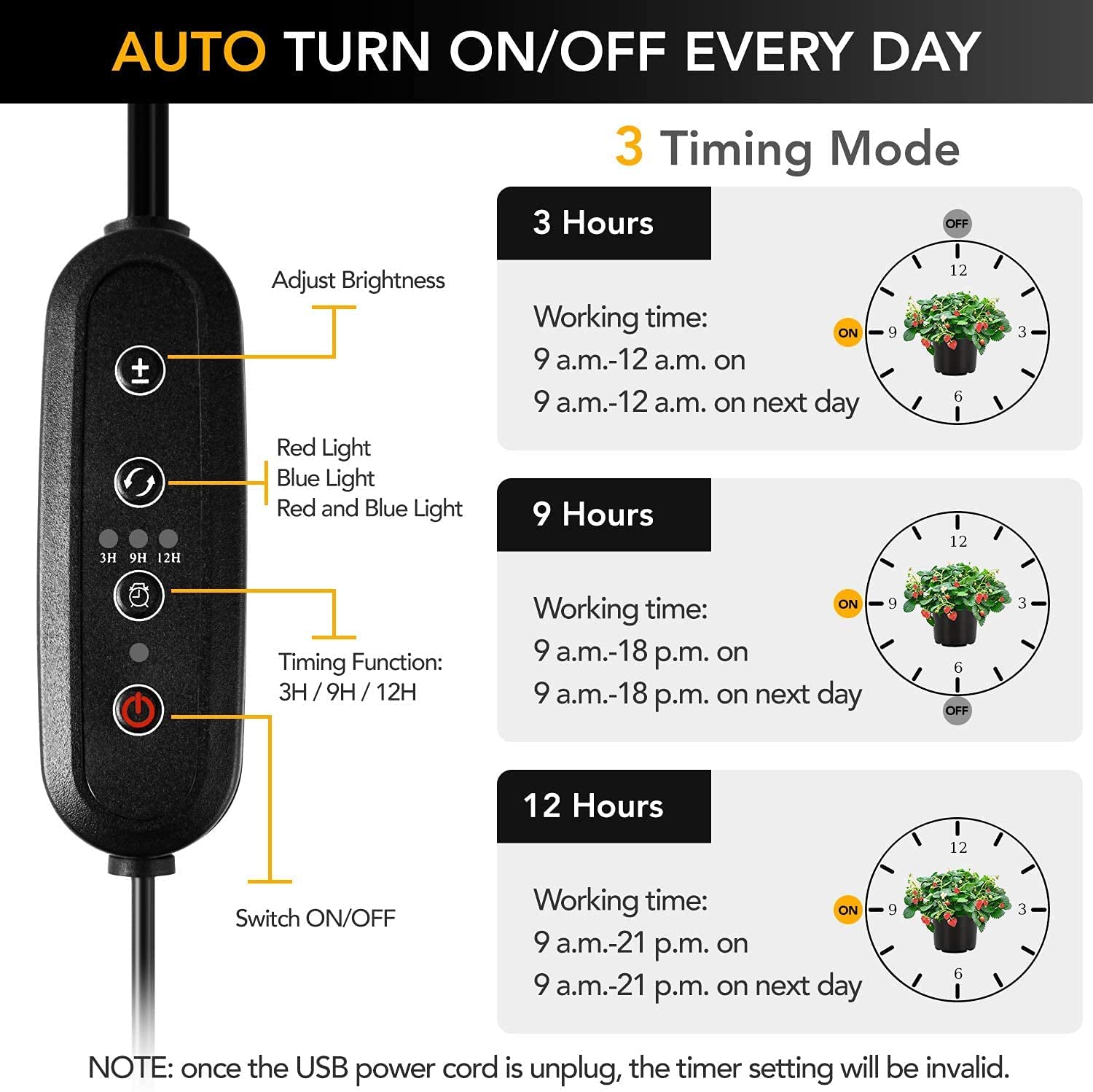 - **Intelligent Timer Function**: Equipped with a smart timer, this growth lamp automatically turns off after 3, 9, or 12 hours, allowing for a seamless 24-hour cycle. Please note that timer settings need to be reset if the USB power cable is disconnected.