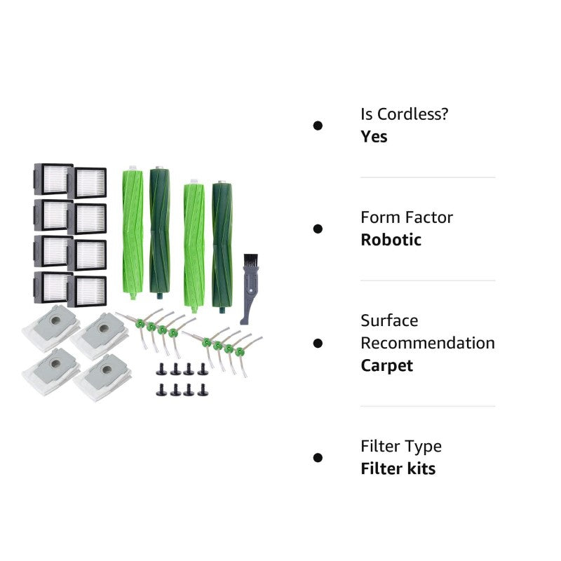 This replacement parts set is designed for the iRobot Roomba E series E5 (E5134), E6 (E6198), E7, and I series i7(7150), i7+ i7 plus(7550) devices.