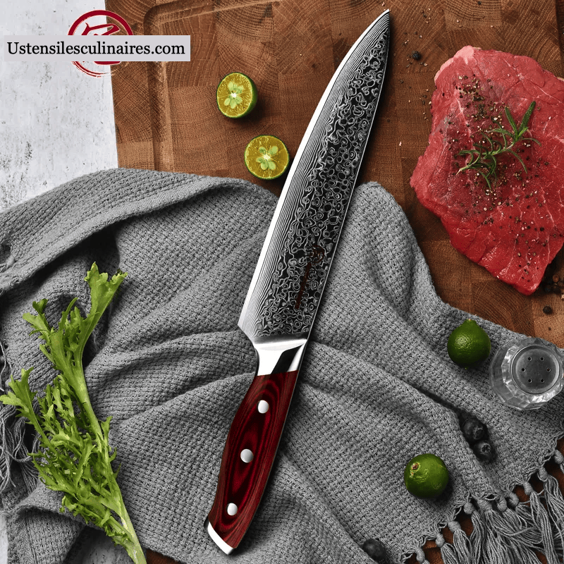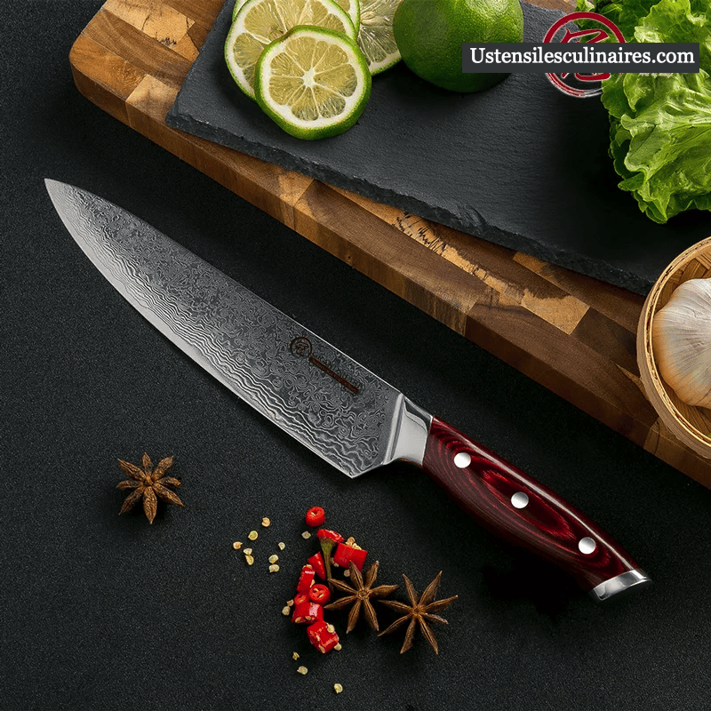 Step into a realm of exceptional quality with our Japanese Santoku Skorter in Damascus steel. Renowned for centuries in the creation of superior swords, Damascus steel delivers an unmatched quality. Its distinctive composition, featuring intricate patterns reminiscent of microscopic saw teeth, provides the blade with extraordinary sharpness, essential for any passionate chef.