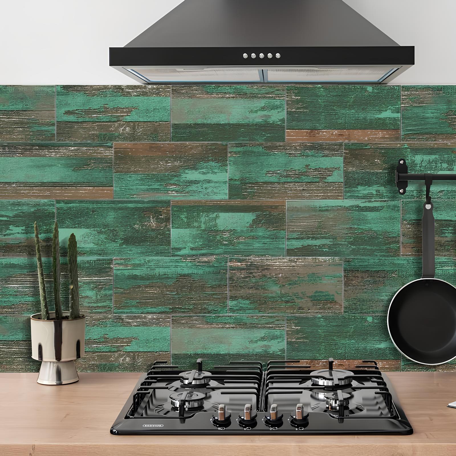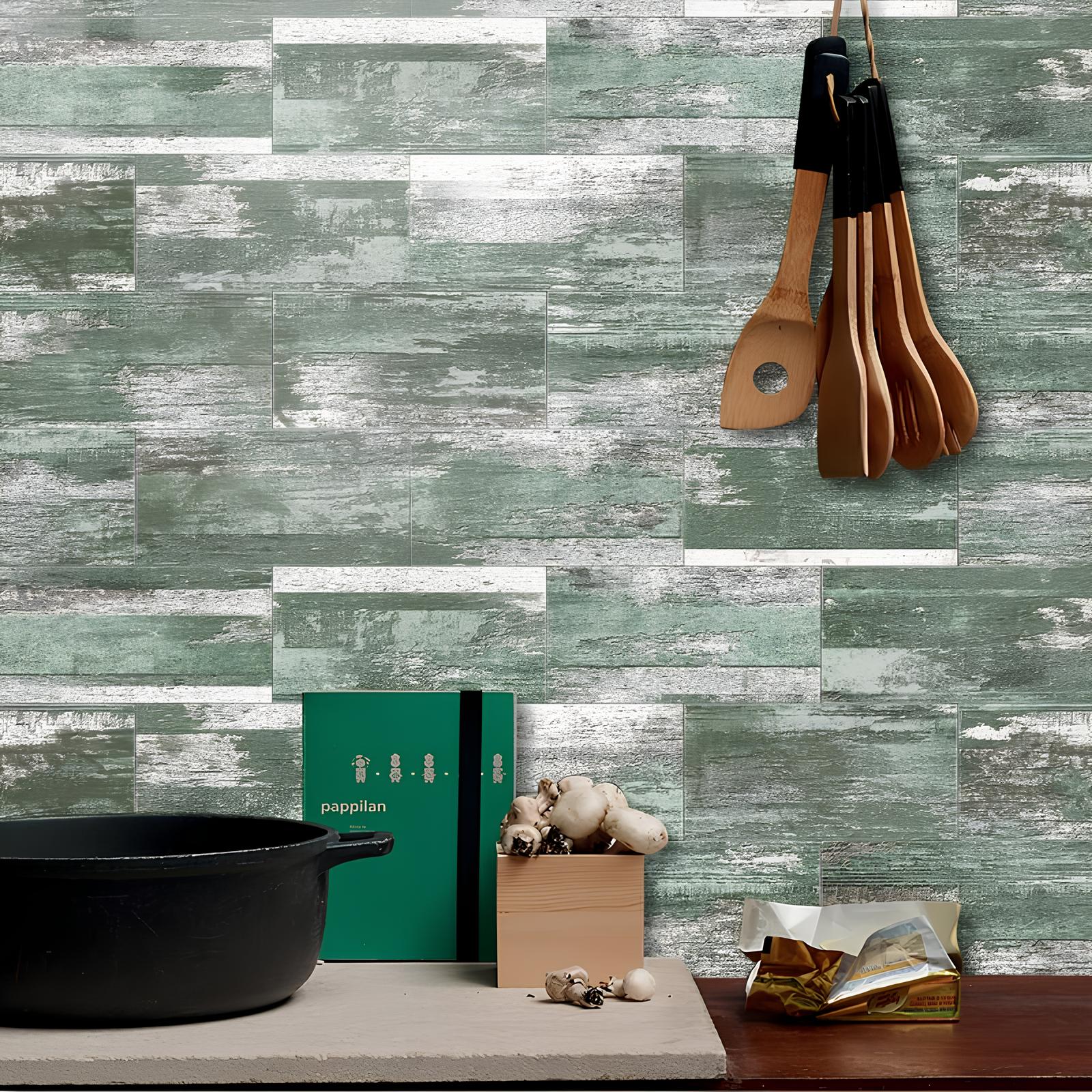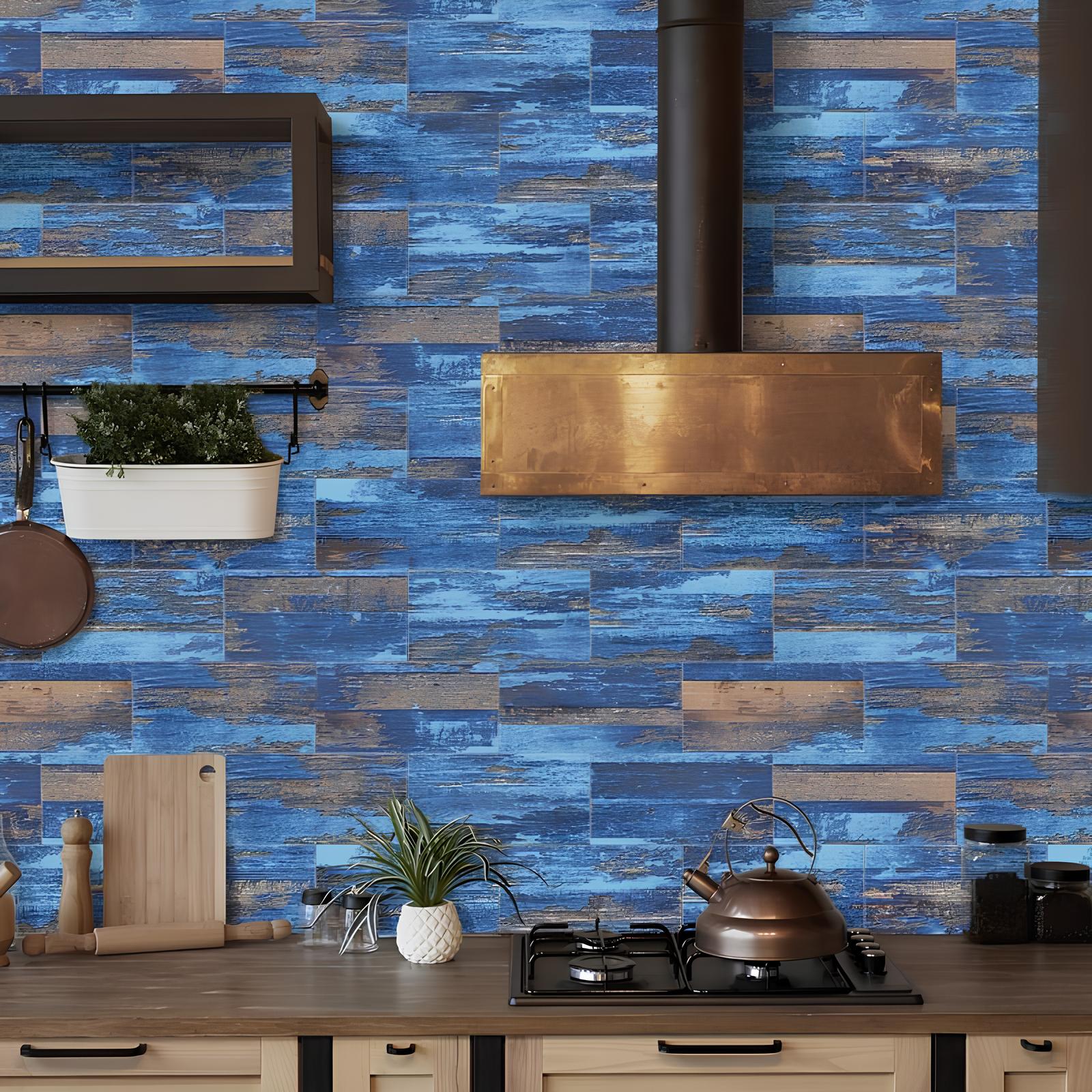 Revitalize your space with our set of 16 Skorter self-adhesive tiles featuring vibrant wood patterns. Create a modern and contemporary industrial aesthetic in your kitchen or any area of your home.