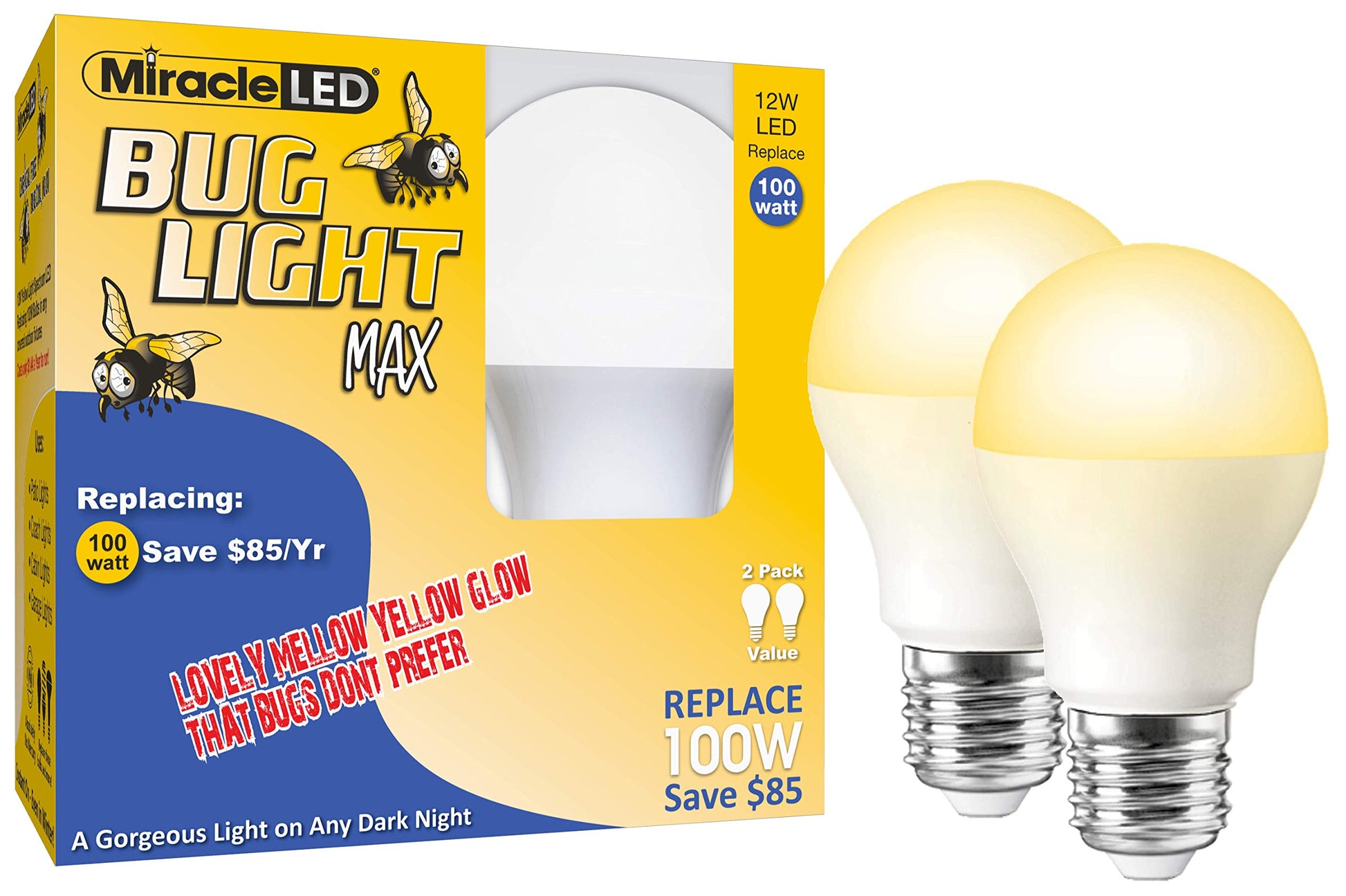 Skorter | Miracle Led Yellow Bug Light Max - 100W Equivalent A19 Outdoor Light Bulb - 2 Pack for Porch & Terrace