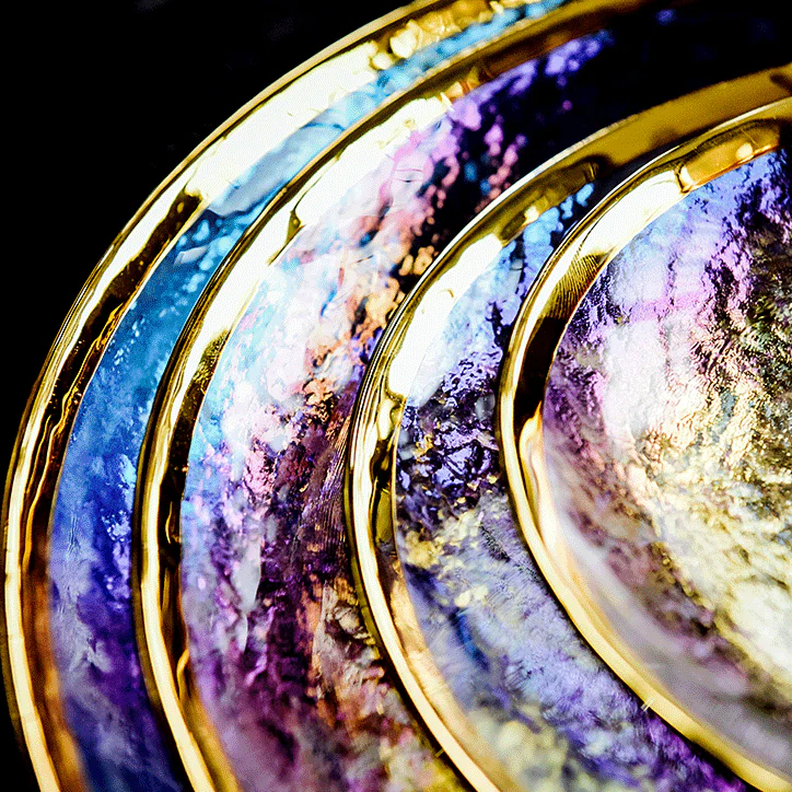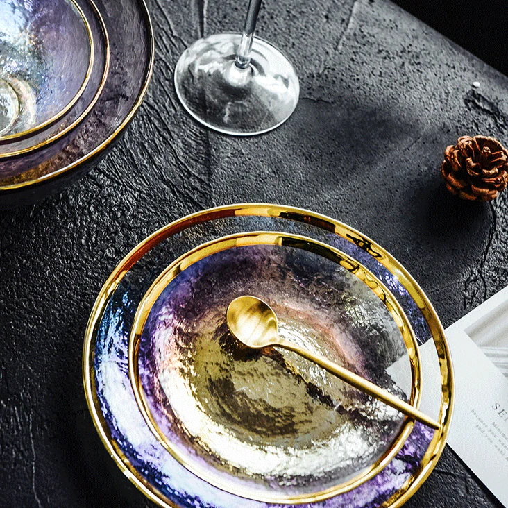 Discover our exclusive collection of tableware, Opale, crafted to enhance your dining experience with a contemporary elegance. Made from transparent glass featuring rainbow-like reflections, our Skorter plates showcase organic shapes adorned with a brilliant golden rim.