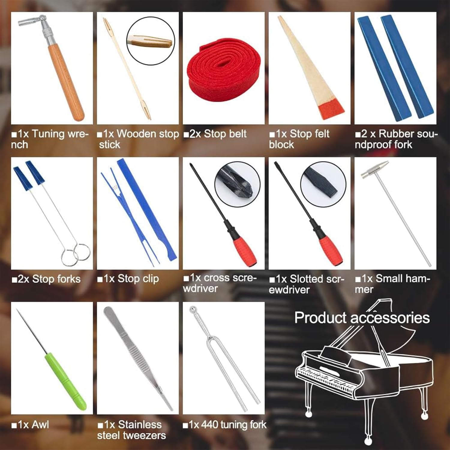 - Package contents: 16 piano tuning tools + storage case