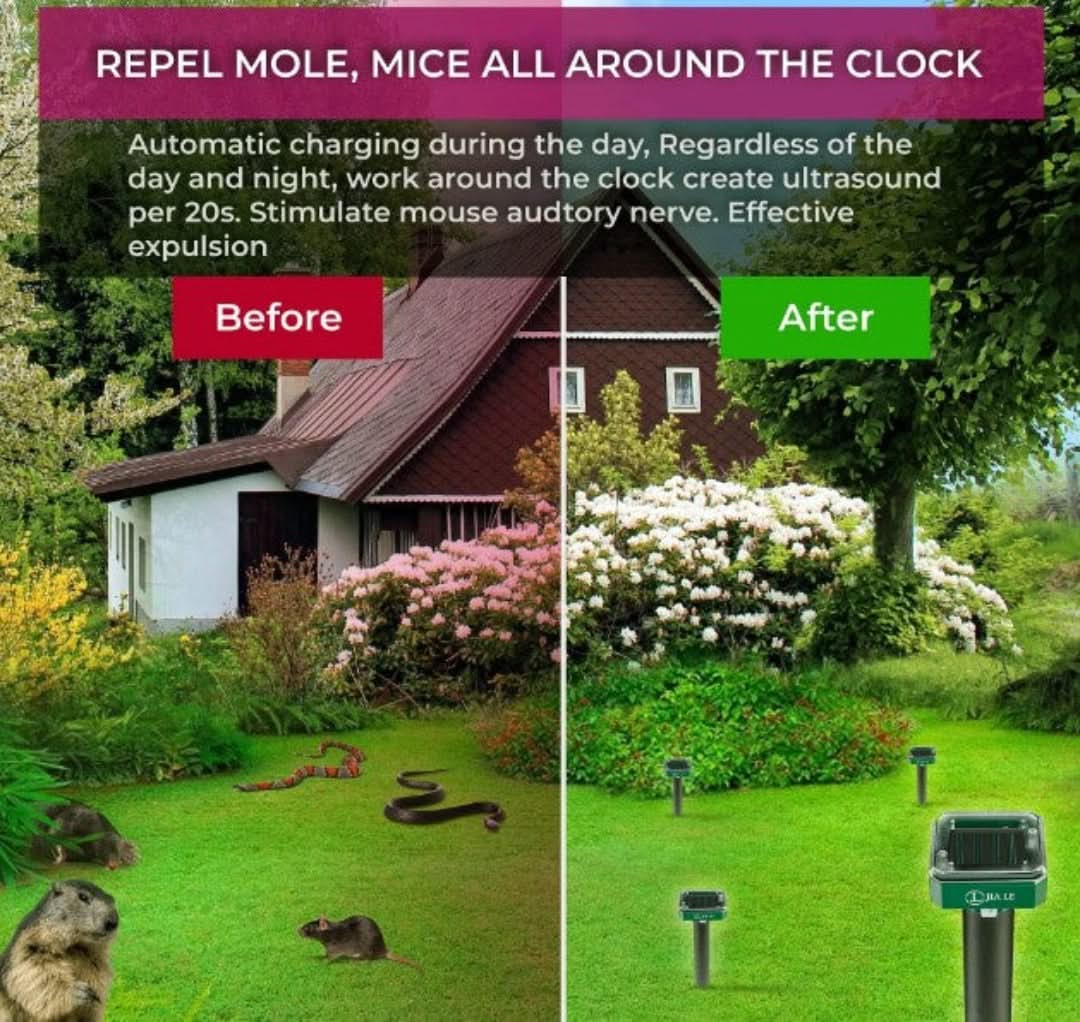 Embrace ultrasonic sound waves to effectively drive away mice, groundhogs, and snakes, ensuring your garden, land, or farm remains undisturbed for a serene atmosphere.