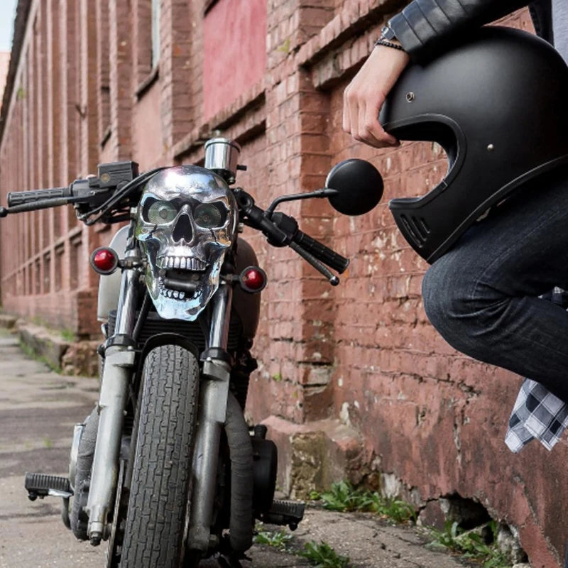 The SKULLBLAZE LED headlight features a captivating aesthetic paired with modern technology. Its eye-catching vintage skull design in a glimmering metallic finish imparts a distinctive flair to any motorcycle, while the energy-efficient LEDs deliver exceptional brightness and enhance safety during nighttime rides.