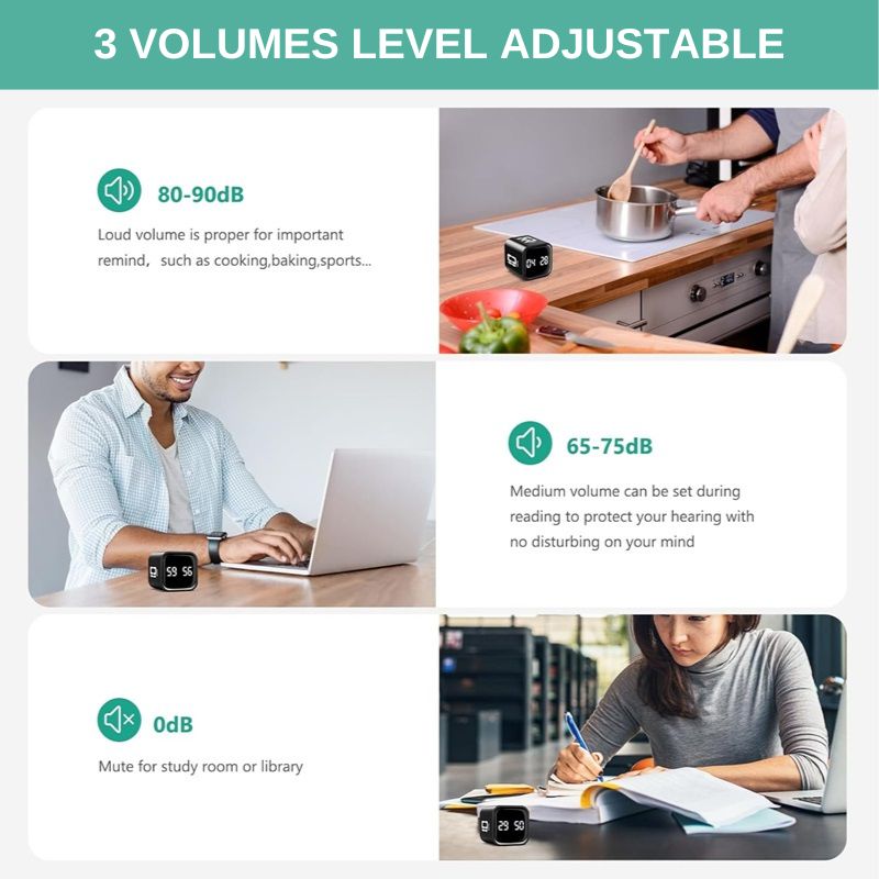 Whether you enjoy complete silence or an audible notification, our Smart Cube Timer offers three sound options: silent/vibration, low (70-80 dB), and high (90-100 dB). This versatile digital timer is ideal for quiet offices as a Pomodoro timer, or in bustling kitchens as a reliable kitchen timer. Keep to your timetable without disturbing your surroundings, making it the perfect work timer for any scenario.