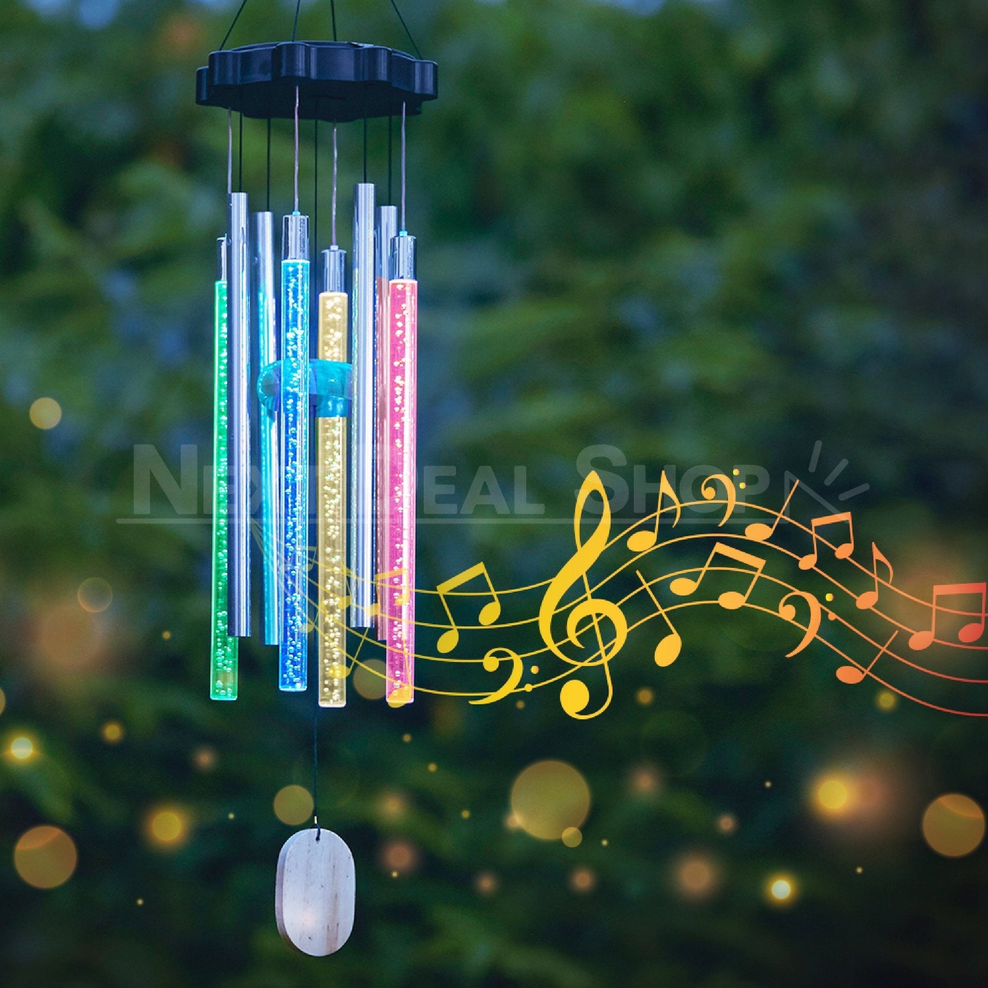 This enchanting wind chime, powered by solar energy, emits a delightful and colorful symphony! Position it outdoors in sunlight to recharge, and observe as the lights illuminate at night!