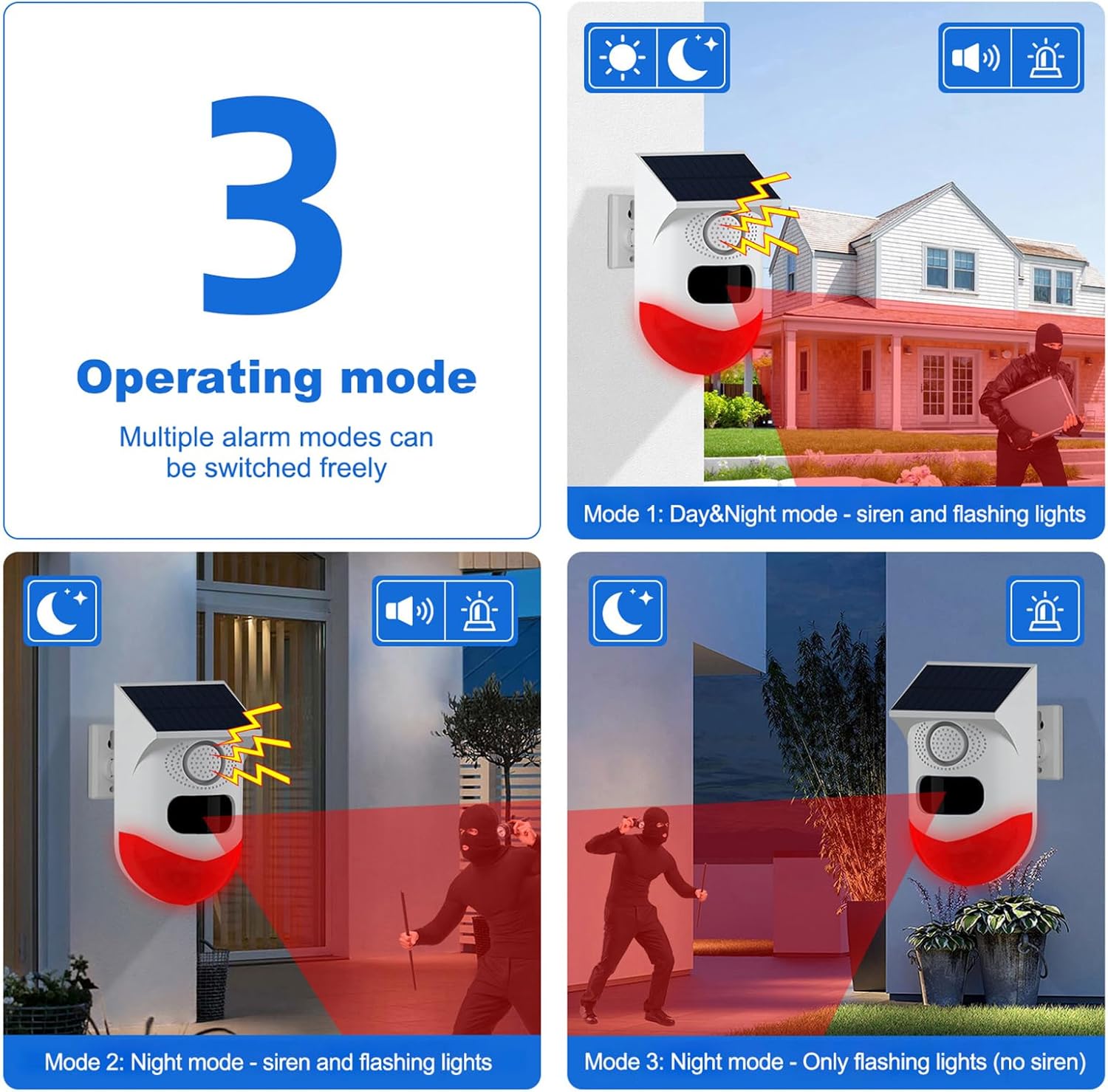 This solar-powered motion sensor alarm combines a 120 dB siren with bright LED strobe lights to deter intruders, animals, or unwanted visitors. With a detection range of 9–12 m and a 110° angle, it provides wide coverage and instant alerts. The built-in 600 mAh rechargeable battery offers up to 30 days of standby time and supports solar or USB charging. Featuring IP65 waterproofing, it is ideal for outdoor use in farms, orchards, homes, and construction sites. Three working modes let you choose between full alarm, night-only alarm, or silent flashing lights.