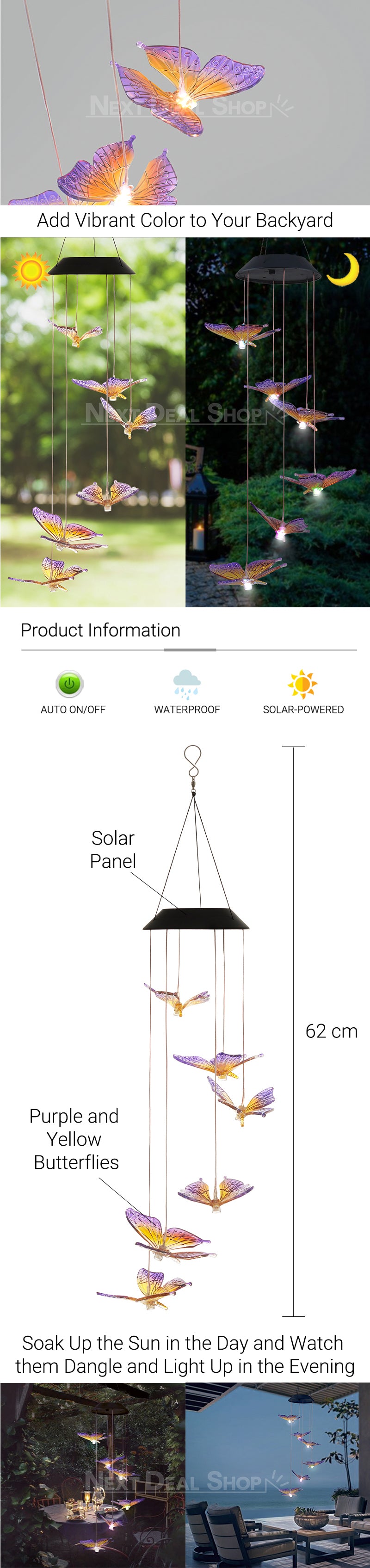 | Product Color | Solar Panel: Black Fluttering Butterflies: Purple and Yellow |