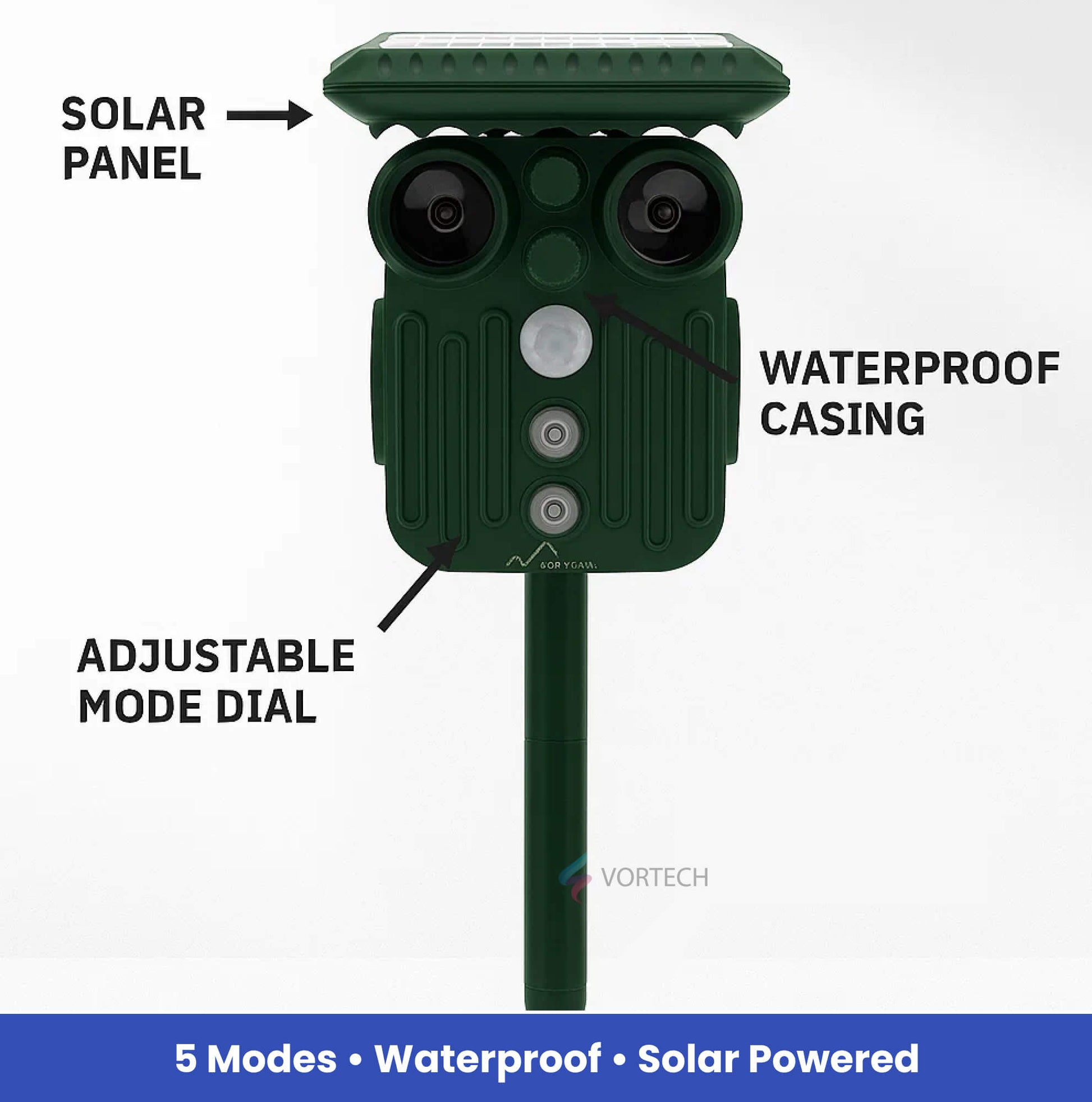 ENVIRONMENTALLY FRIENDLY: Efficiently deters deer and other animals without inflicting harm. Made with anti-UV and waterproof materials, it performs reliably in all weather conditions. Powered by SOLAR energy recharges in the sun, so there’s no need for power outlets or batteries!