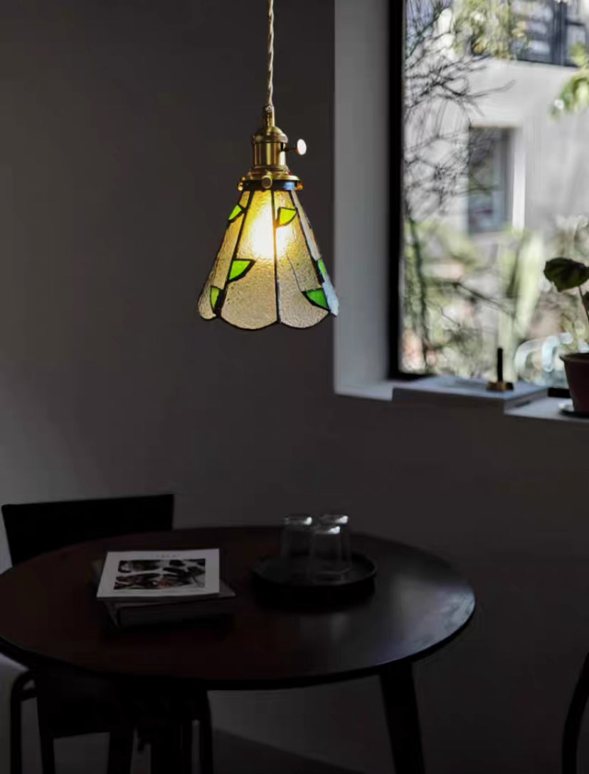 This clear bubble glass pendant lamp, adorned with green leaf-inspired glass details, acts as a revitalizing ceiling fixture for a modern living space, a sophisticated kitchen island illumination for a cheerful farmhouse kitchen, and a delightful overhead light for a cozy rustic dining setting.