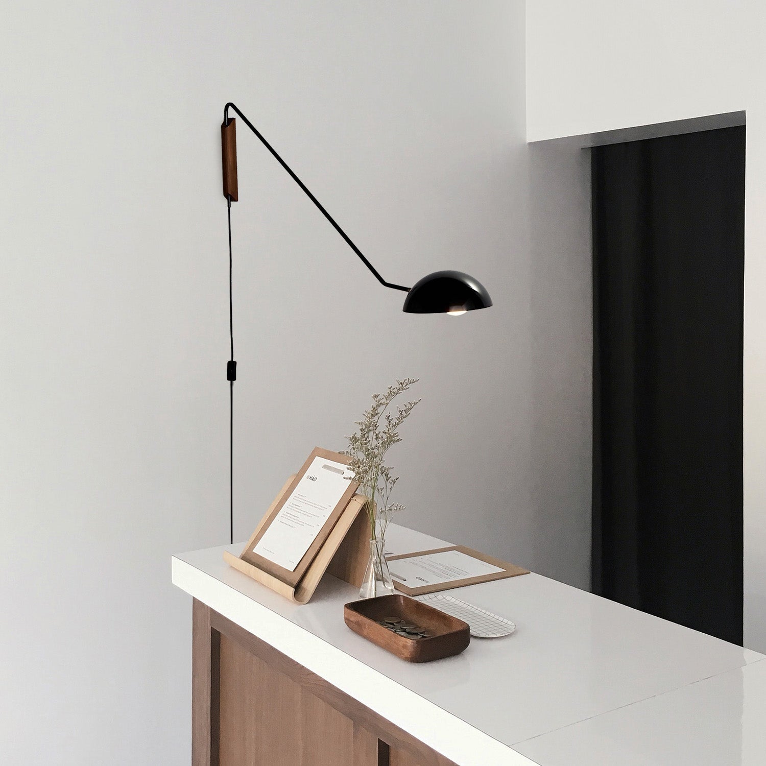 Skäm bort ditt utrymme med den eleganta sofistikeringen hos Articulate Lumina vägglampa - Swing Dome Light, där praktiskhet möter modern charm. Denna anpassningsbara vägglampa har en utdragbar lång stång och svängarmsdesign, vilket ger exakt belysning precis där det behövs. Designad med en elegant svart finish och inbjudande trädetaljer, kompletterar denna lampa sömlöst olika interiörer, från moderna till traditionella. Oavsett om det handlar om att skapa atmosfär i vardagsrummet, framhäva konstverk eller ge arbetsbelysning i en arbetsyta, introducerar Articulate Lumina vägglampa en antydan av raffinerad elegans och användbarhet till vilken vägg som helst den pryder.