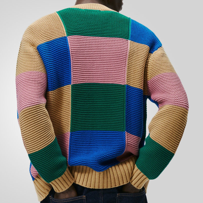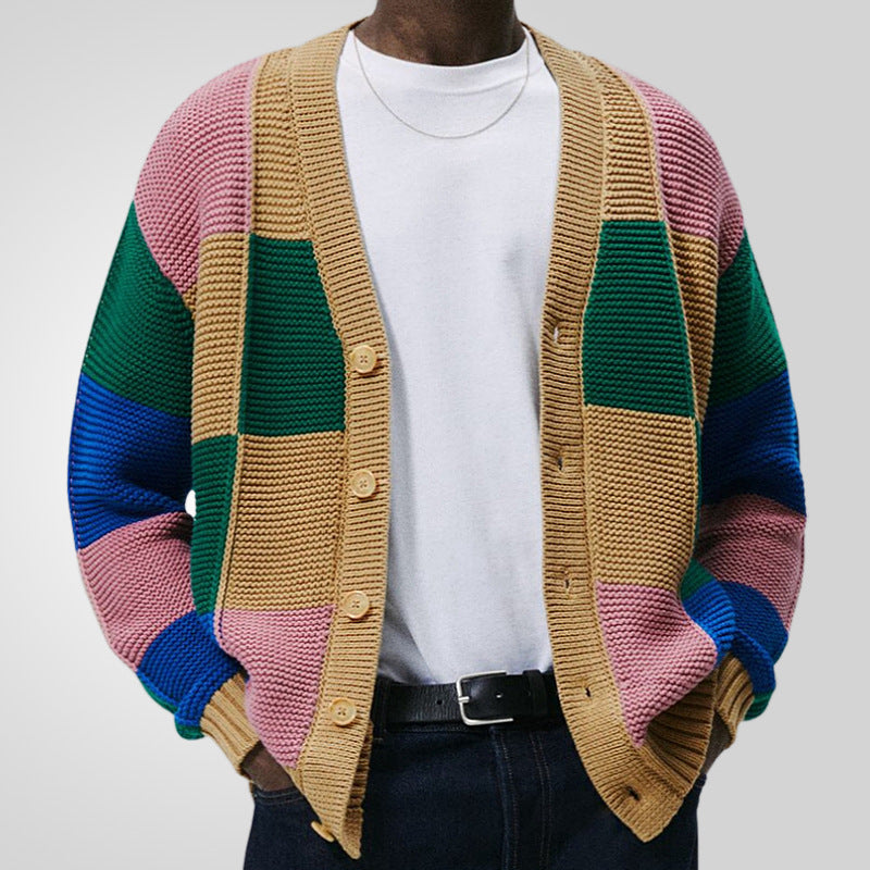 Upptäck herrkoftan med färgglatt blockmönster från Skorter – den perfekta följeslagaren för stilfulla män. Denna kofta kombinerar komfort och mode i en tidlös design.