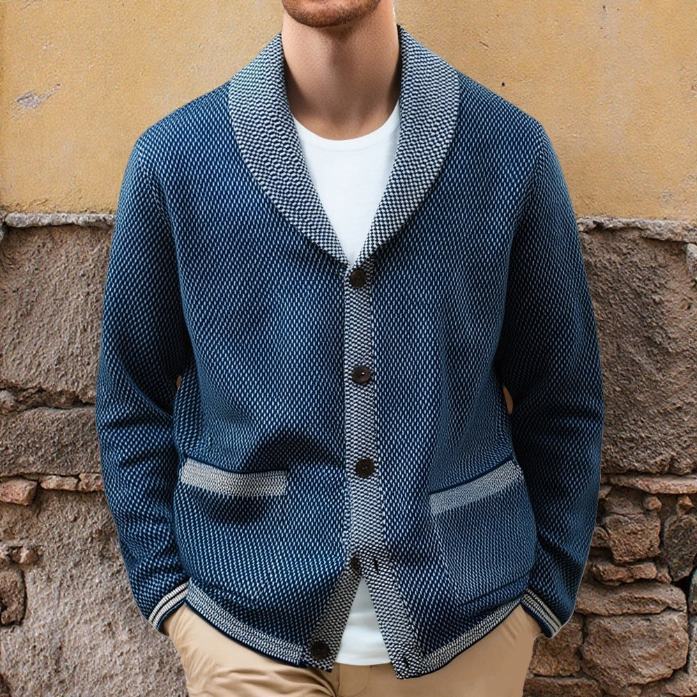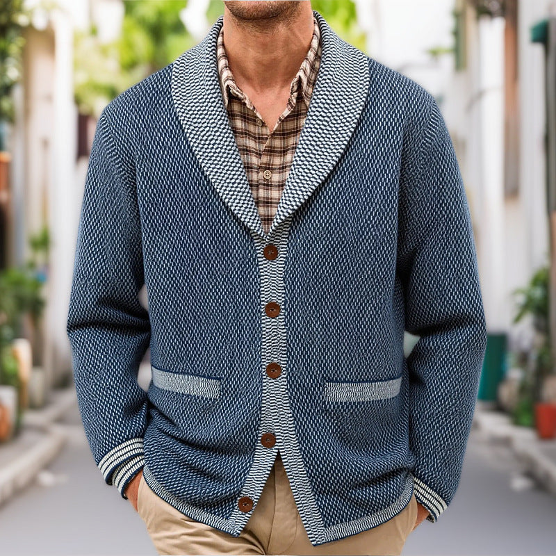 Upptäck den snygga herrkoftan med eleganta knappdetaljer och bred sjalkrage från Skorter. Denna trendiga kofta kombinerar komfort med en touch av elegans och är den perfekta följeslagaren för alla tillfällen.