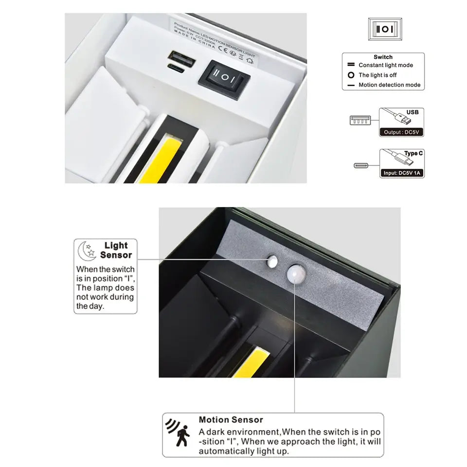 Denna väggmonterade batterilampa finns i två färgalternativ: svart och vit. Den kan laddas via både USB- och USB-C-kablar och är utrustad med en ljussensor samt en rörelsesensor. Rörelsesensorn aktiverar lampan inom ett avstånd av 6 meter och stänger automatiskt av den efter 20 sekunders inaktivitet.