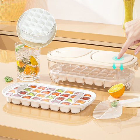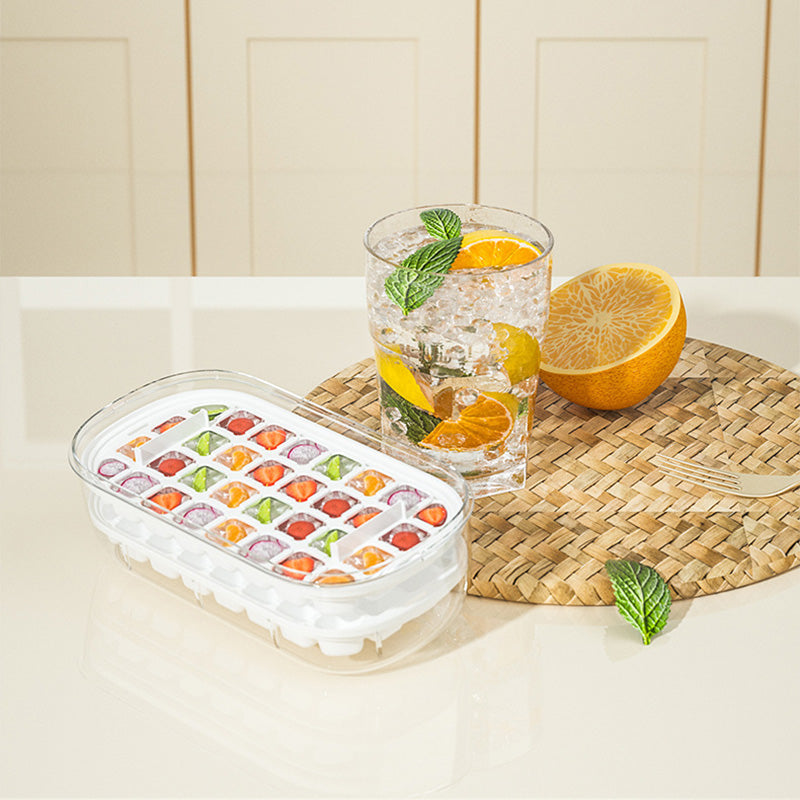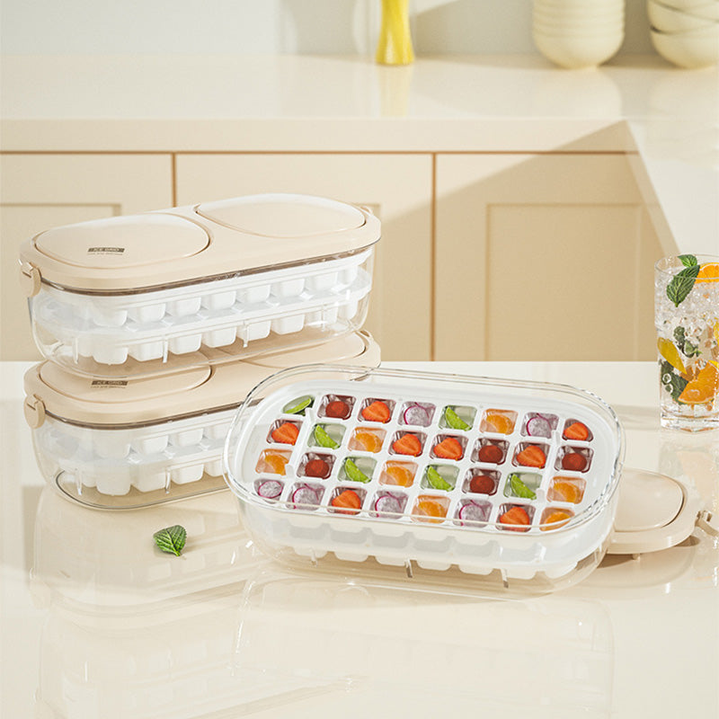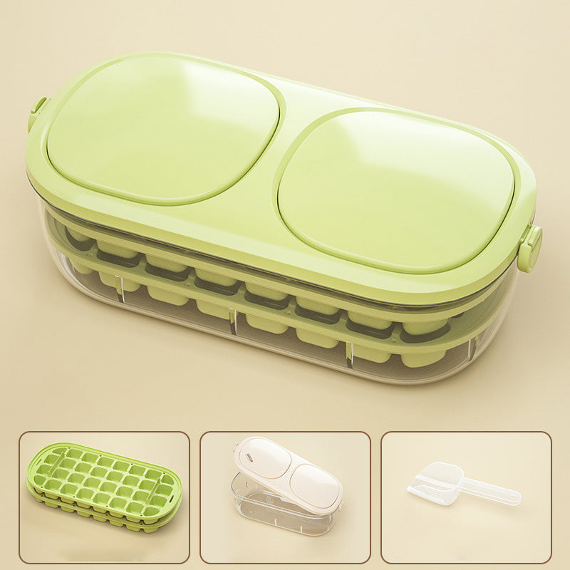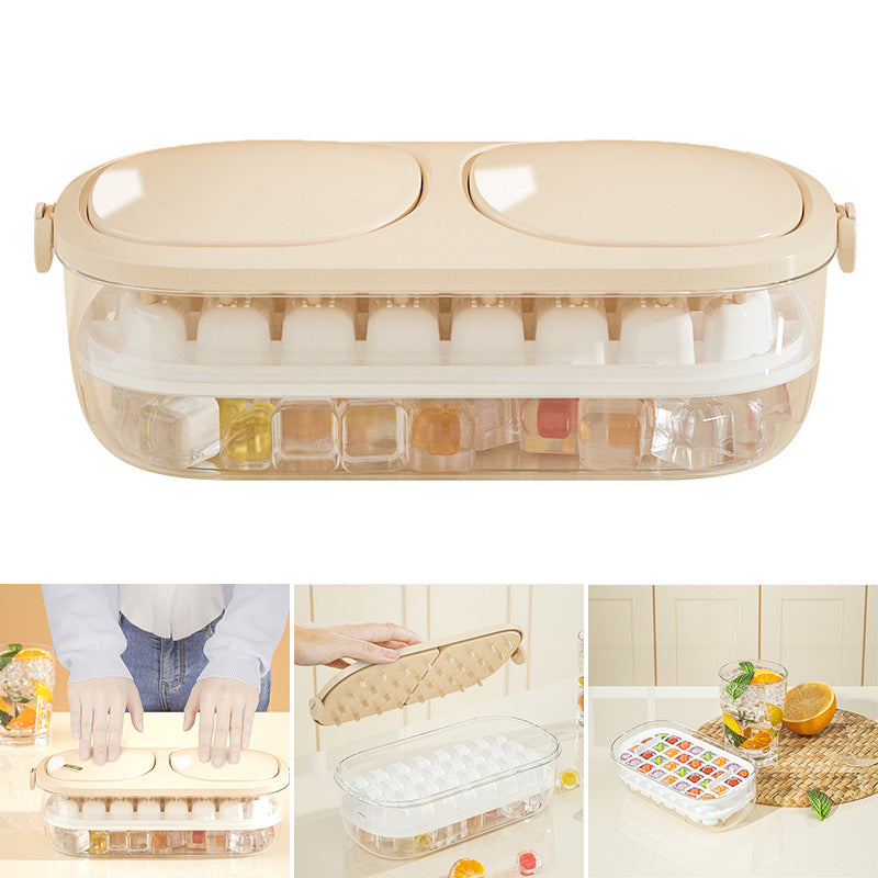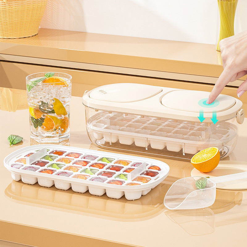 Enkel isborttagning – Isbitsformen i pressform möjliggör snabb och enkel isutvinning. Med bara en knapptryckning kan 32 isbitar dispenseras direkt. Denna smarta design förbättrar istillverkning, isutvinning och förvaring avsevärt jämfört med konventionella isbitsformar.