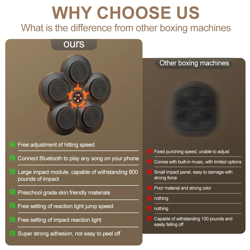 Förbättra din träning med RhythmBox Wall Trainer – en banbrytande boxningsapparat som kombinerar rytm, konditionsträning och precision. Med justerbara hastigheter, Bluetooth-anslutning, LED-indikatorer och ett pekskärmsgränssnitt är varje boxningsslag inte bara kraftfullt utan också fängslande.